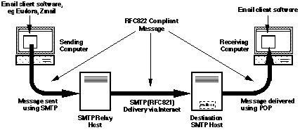 A POP client (eg Eudora, Netscape Mail, MS Outlook) establishes a TCP connection (on port 110) to a server process on the (eg) Unix system where the mailbox resides. The user is authenticated (username/password), and the contents of her mailbox is downloaded for processing on her PC or Mac.